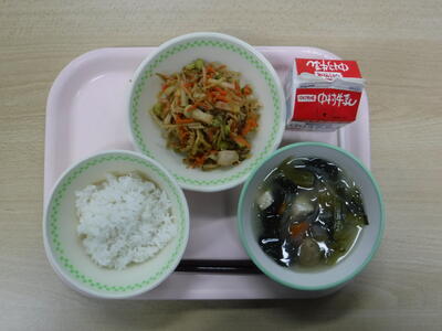 【麦ごはん 鶏肉の唐揚げ もやしのレモン和え もずくスープ 牛乳】