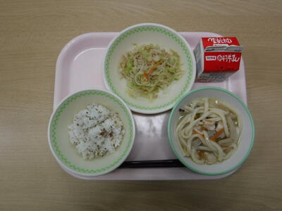 【(減)梅菜めし じゃこてんうどん もやしとツナの和え物 牛乳】