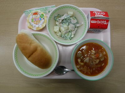 【くろパン ミネストローネ じゃがいもとさつまいものサラダ 牛乳】