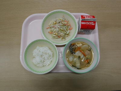 【麦ごはん フカのごまみそあえ 根菜汁 牛乳】
