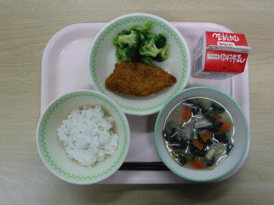 【麦ごはん あじチーズフライ ゆでブロッコリー キムチ汁 牛乳】