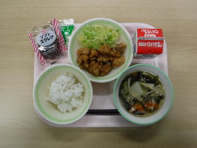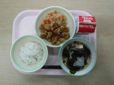 【麦ごはん 鶏肉のからあげ キャベツのおかか和え わかめ汁 牛乳】