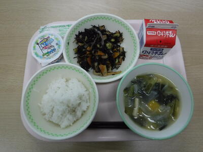 【麦ごはん かぼちゃのいももち汁 ひじきの炒め煮 牛乳】