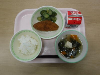 【麦ごはん たらのカレー揚げ のっぺい汁 牛乳】