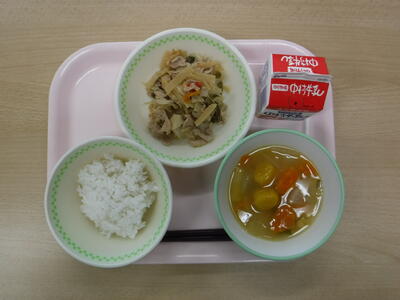 台風で昨日が臨時休業になったため、プリントをお配りしていた通り、献立が1日ずつずれることになりました。今日は、昨日予定していたメニューです。