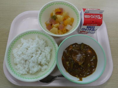 今日は、ゴーヤやなす、かぼちゃが入った夏野菜カレーでした。「ゴーヤがいやだ…」と気になる様子の子どもたちでしたが、カレーとフルーツポンチのおかげでよく食べていました。今日で1学期最終日です。2学期もおいしい給食を用意していますので、お楽しみに!