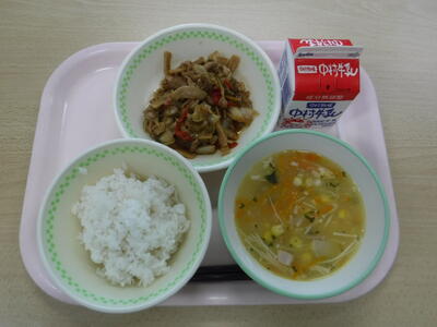 【麦ごはん ホイコーロウ 中華コーンスープ 牛乳】
