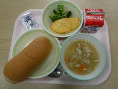 【コッペパン トマトオムレツ ゆでブロッコリー コーンスープ 牛乳】