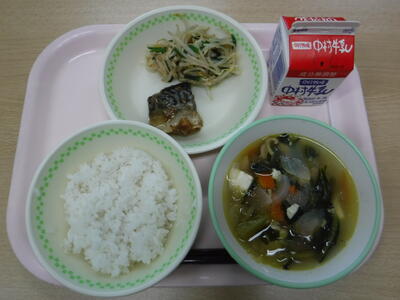 今日は「骨」についてのお話です。私たちの骨の量は、10代で一番多くなり、30歳くらいからだんだん少なくなって、骨そしょう症という骨が折れやすい病気になることがあります。骨を丈夫にするには、10代の時期に骨のもとであるカルシウムの多い食べ物をとることが大切です。今日の給食では、ちりめんやわかめ、、牛乳、ヨーグルトなどにカルシウムが多く含まれています。今日の川南町でできた食べ物は、ぶた肉、玉ねぎ、キャベツ、きゅうりです。