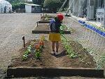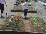 今回は、西側。県道に面した西端、フェンスの外ですが、あじさいが鮮やかです。西門付近に目を移すと、新しく植え替えた花が元気に育っています。また、種から育てたヒマワリが花を咲かせ始めました。夏の到来を感じます。