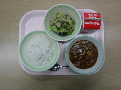 【麦ごはん カレー豚じゃが 菜の花とほうれん草のごま和え 牛乳】