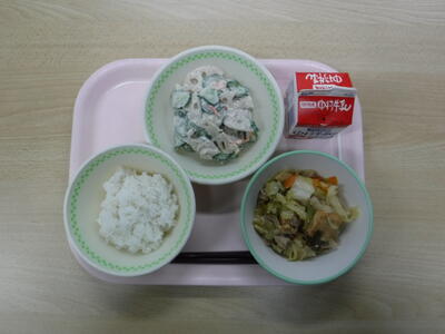 【麦ごはん 鶏肉のからあげ キャベツのおかか和え わかめ汁 牛乳】