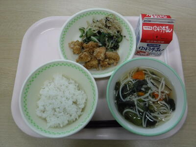 【麦ごはん 鶏肉の唐揚げ のりかつあえ 魚そうめん汁 牛乳】