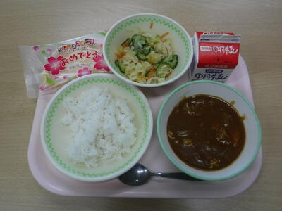 今日から1年生のみなさんは給食がスタートします。給食を楽しみにしていた人も多いのではないでしょうか。初めての給食はチキンカレーとコールスローサラダ、そして、入学と進級のお祝いクレープです。6年生のお兄さんやお姉さんが給食の準備をしてくださいます。みなさんはきちんと手を洗って、静かに準備をまちましょう。準備ができたらみんなで一緒にいただきますのあいさつをします。給食時間は短いので、はじめは食べるのが大変かもしれませんが、少しずつなれて楽しく食事をしましょう。今日の川南町でできた食べ物は、米、じゃがいも、たまねぎ、キャベツ、きゅうりです。