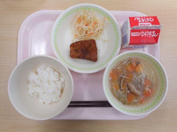【麦ごはん 枝豆と豆腐のミンチカツ キャベツのおかか和え 根菜汁 牛乳】