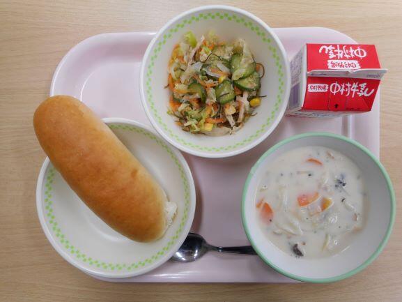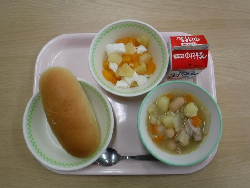 【ミルクパン ポークビーンズ フレンチサラダ 牛乳】