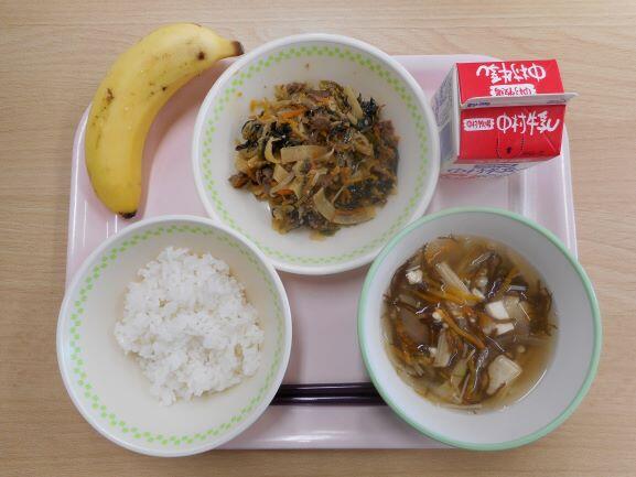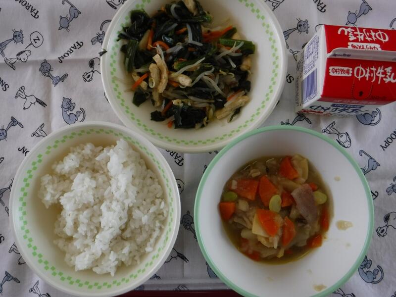 今日は、「海藻」のお話です。長生きする人の食事を調べてみると、海藻をたくさん食べていることがわかりました。海藻に 含まれるミネラルが働いて血管を丈夫にし、血圧を下げてくれるからです。海藻の仲間にはわかめ、こんぶ、もずく、のり、ひじきなどがあります。今日の給食にも海藻が入っているのが分かりますか?今日は、焼きのりを少し混ぜて「いそかあえ」にしました。海藻は、水溶性の食物繊維もたくさん含まれるので、おなかの調子もととのえてくれます。乾燥したものは保存もきくので、使いやすい食材です。わかめをみそ汁に入れたり、ごはんにのりを合わせて食べたりするといいですね。今日の川南町でとれた食材は、米、豚肉、たまねぎです。