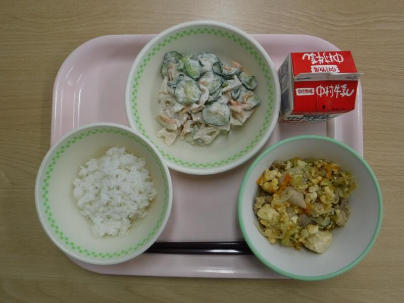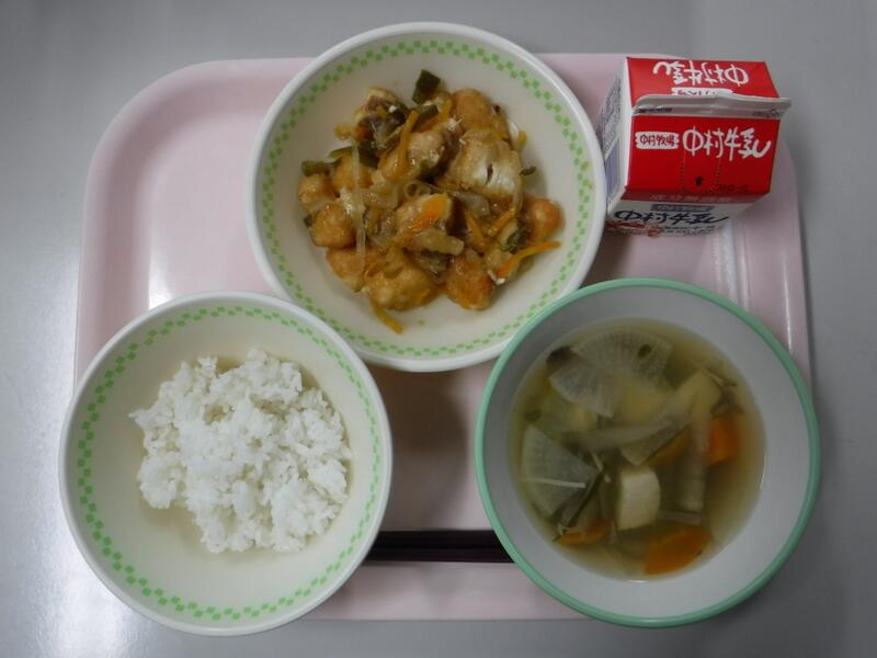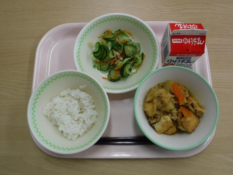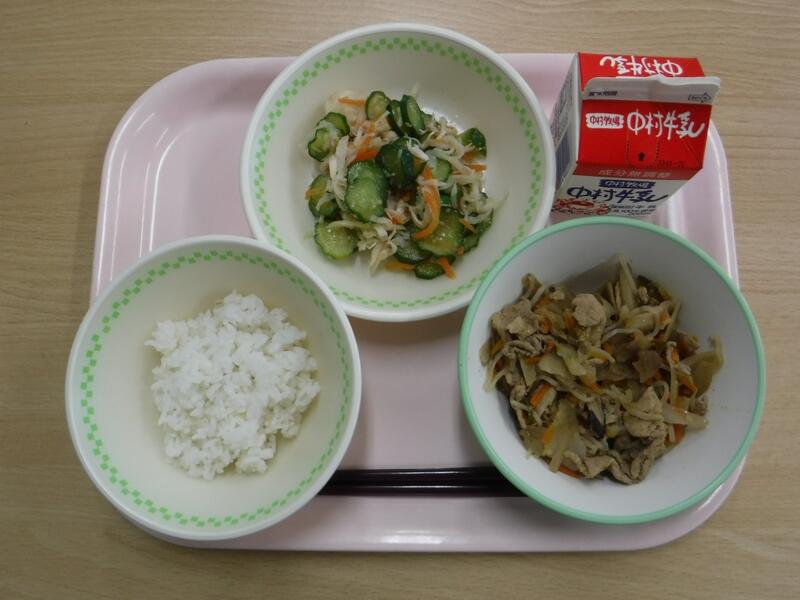 今日は19日なので、食育の日です。食べることは、生きる上での基本だと、よく言われます。元気な体がなければ、みなさんは勉強や運動にも身が入らず、もっている力を十分に発揮することができません。なんだか調子が悪い、とか、ささいなことにイライラしたり、気分が沈んだりする、という人はいませんか?何を食べるかは、心と体の調子にもかかわっています。好きなものだけでなく、いろいろなものを食べて、元気な心と体を作りましょう。今日の川南町でできた食べ物は、ぶた肉、たまねぎ、なす、きゅうりです。