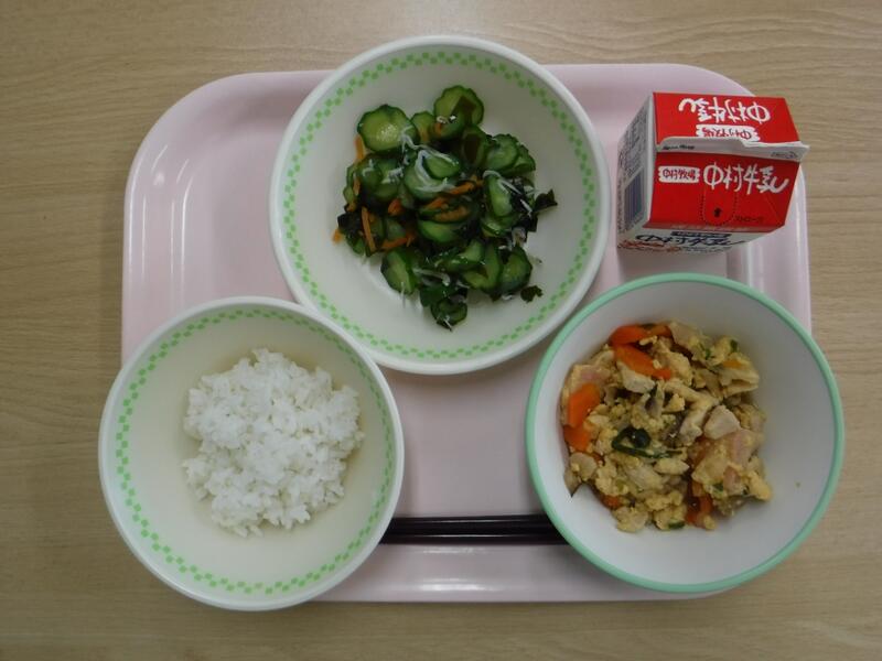 長かった夏休みが終わり、今日から2学期のスタートです。2学期最初の給食は、カレーにしました。食欲が落ちている人もいるかもしれませんが、これから体育大会や運動会の練習もあります。食べ物から栄養をとって、熱中症にも負けない、元気な体を作りましょう。今日は、鶏肉のお話をします。給食では、すべて宮崎県産のとり肉を使っています。ニワトリの原種は東南アジアに住んでいたキジの仲間で、3000年以上前から人間に飼われていました。日本では、奈良時代ごろから飼い始めて、明治時代からは、卵をとったり肉を食べたりするために飼うようになりました。とり肉は私たちの体を作るもとになるたんぱく質がたくさん含まれています。肉のせんいが細くてやわらかいので、消化がよい肉です。命に感謝して食べましょう。今日の川南町でできた食べ物は、米、きゅうりです。