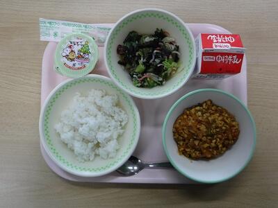【わかめごはん 鶏肉の唐揚げ もやしのレモン和え もずくスープ チョコタルト 牛乳】