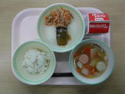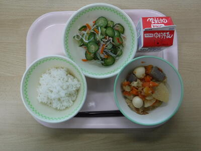 【麦ごはん いわしの甘露煮 のっぺい汁 キャベツのおかか和え 牛乳】