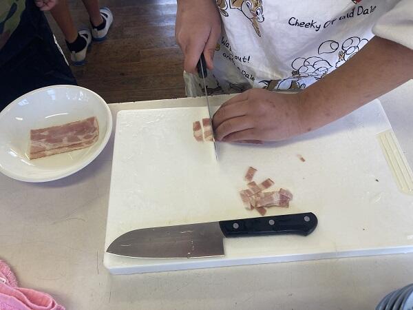 ジャガイモの皮をむき、ジャガイモの芽に気を付けてカットしたり、ベーコンを食べやすい大きさにカットしたり、