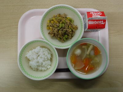 【麦ごはん あじそぼろ丼(具) 白玉団子汁 牛乳】