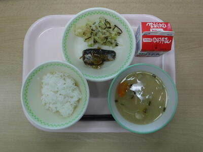 【麦ごはん いわしの生姜煮 キャベツの塩昆布和え さつまいものみそ汁 牛乳】