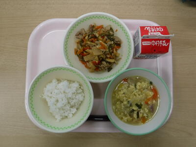 【麦ごはん チンジャオロース 卵スープ 牛乳】