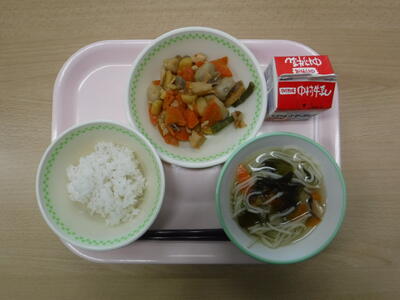 【麦ごはん 秋野菜の煮物 魚そうめん汁 牛乳】