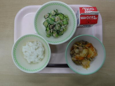 【麦ごはん じゃが豚キムチ 枝豆サラダ 牛乳】