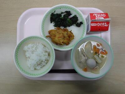 【麦ごはん ぶた汁 がね ほうれん草の磯香和え 牛乳】
