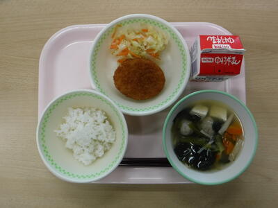 【麦ごはん 日向鶏コロッケ コールスローサラダ つみれ汁 牛乳】