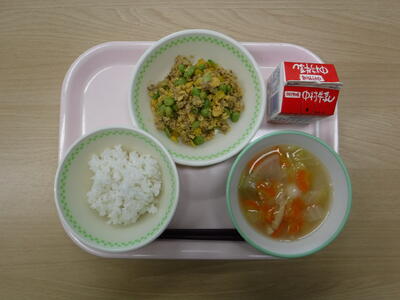【あじそぼろ丼 白玉団子汁 牛乳】