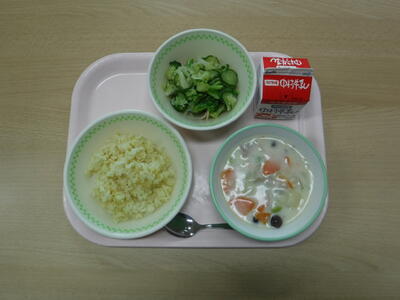 今日の給食は、ご飯の上に大きいおかずのクリームかけピラフの具をかけて食べて下さい。みなさんは、食事の時に、よくかんで食べていますか。食べ物をよくかむことで脳に信号がいき、「おなかいっぱい」と感じて食べすぎを防ぐことができます。また、だ液がたくさん出て、食べ物の消化や吸収を助けてくれたり、虫歯を予防してくれたりします。その他にもよくかむことで、あごの筋肉がよく動き、脳への血のめぐりがよくなり、脳の働きを活発にしてくれます。このように、よくかんで食べることは、体に良いことがたくさんあります。みなさんも普段の食事はしっかりかんで食べるように心がけましょう。今日の川南町でできた食べ物は、米、じゃがいも、人参、キャベツ、きゅうり、クリームかけピラフに使われている牛乳です。