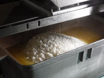 カレー粉と塩を釜に入れ、湯と米が自動で投入された後、よく混ぜて炊きます。