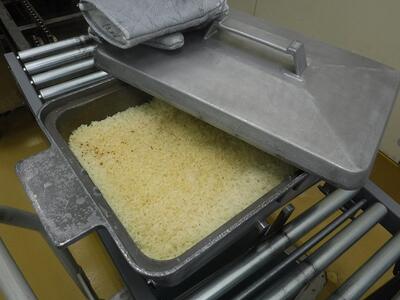 今日のクリームかけピラフは、初めてのメニューでした。米にカレー粉と塩を混ぜて炊いた黄色いピラフに、大きいおかずをかけて食べます。調理場では、洗米、浸水、炊飯までがオートで行われる炊飯システムという大きな機械でお米を炊くので、芯が残らずにちょうどいいくらいに炊けるか、炊きあがりの量が多すぎたり少なすぎたりしないか、調味料がうまく混ざるかなどを考えなければいけません。季節や天気によっても若干米の水分量が変わるので、炊き上がりが変わってくるそうです。調理員さんと試行錯誤しながら水と米の量を調整し、今日を迎えました。子ども達の反応はどうか、残食がたくさん残ってこないか、調理員さんと朝からドキドキでした。給食時間になり、教室を見てみると、初めてのメニューなので、6年生も「これかけていいと?」とおそるおそる食べ始めましたが、食べ終わるのは速かったようです。残食もいつもと大差ないくらいで、一安心。初めてのメニューを出したことで勉強になった部分もあり、先生や子ども達の間で今日の給食についての会話が進んでいるのが聞こえて、嬉しい気持ちになりました。このメニューは、またしばらくして登場させようと思います。
