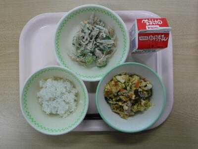 今日は、野菜チャンプルーでした。ゴーヤは入っていなかったのですが、「チャンプルー」という言葉に反応したのか、「これ、ゴーヤ入っていますか?」と慎重に食べている子もいました。「チャンプルー」は「ごちゃ混ぜ」という意味の沖縄の方言で、「炒め物」という意味でも使われるそうです。