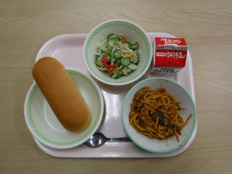 【(減)チーズパン なすのミートソーススパゲッティ ひむかサラダ 牛乳】