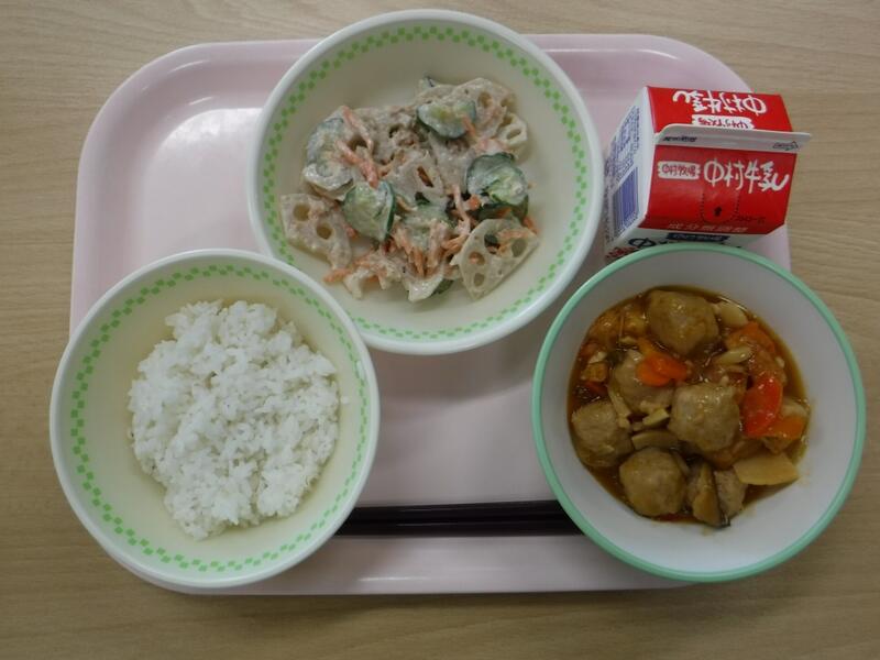 【麦ごはん 肉団子の甘酢煮 れんこんごまサラダ 牛乳】