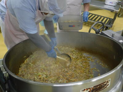 小松菜は、東京江戸川区にある、小松川という地名がもとになっています。江戸時代の初めに、葛西付近で栽培されていた「葛西菜」と呼ばれる野菜を、小松川村の椀屋久兵衛が改良して小松菜になったといわれます。小松菜はほかにも、冬菜、雪菜、うぐいす菜ともいいます。地名から名づけられた野菜には、長野県野沢温泉の特産「野沢菜」などもあります。小松菜は、ほうれん草の3倍ものカルシウムを含み、ビタミンや鉄分も豊富です。ほうれん草はアクをとるために下茹でしますが、小松菜は下茹でしないで手軽にいろいろな料理に使えて便利です。今日はかぼちゃのいももち汁に入っています。今日の川南町でできた食べ物は、米、豚肉です。