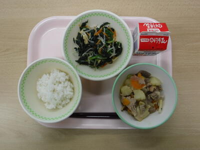 【麦ごはん じゃがいものベーコン煮 千草和え 牛乳】