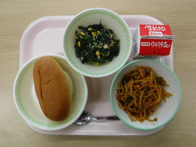給食では、食器や調理場の釜の大きさの都合で、主食を麺単体で出せないので、減量したごはんやパンがつきます。今日は、人気のスパゲティナポリタンに、ミルクパンがつきました。1年生は、初めてのパンでしたね