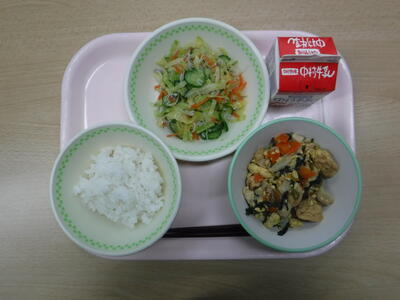 【麦ごはん がんもの卵とじ じゃこサラダ 牛乳】