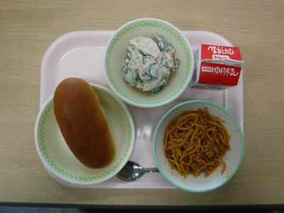 【(減)チーズパン スパゲティミートソース れんこんサラダ 牛乳】