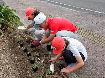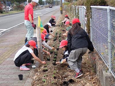 子ども達のために花を植える校長先生の姿を見て、今回は「わたしも花を植えるお手伝いがしたいです」と伝えてくれた人がいたので、花植えボランティアを募集したところ、たくさんの人が参加してくれました。昼休みに校長先生と一緒に春咲きのノースポールやふくろなでしこ、ビオラ、キンギョソウの苗を植えました。