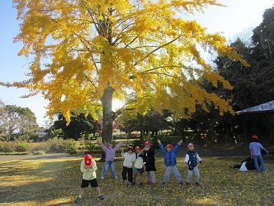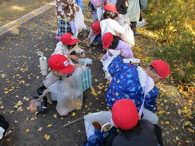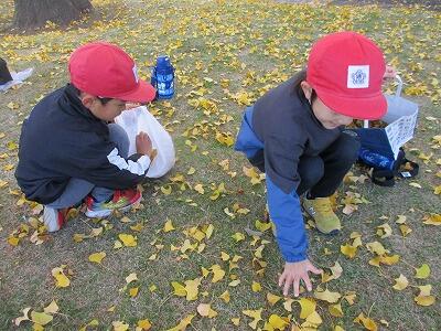イチョウの落ち葉やどんぐりをふくろいっぱいに、たくさん拾いました。自分の顔より大きな葉っぱを見付けた人もいて、先生や友達に自慢している笑顔がとてもかわいらしかったです。