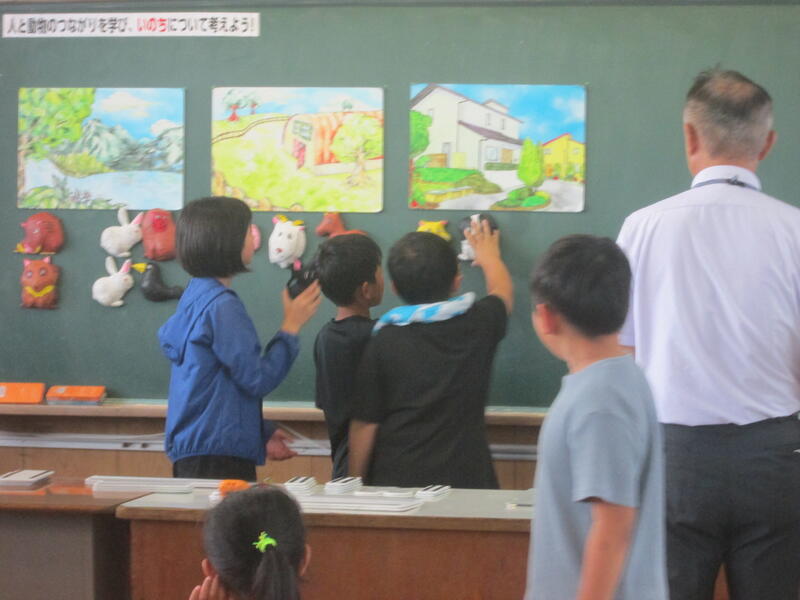 川南小の栄養教諭の先生に来ていただいて食育の授業が行われました。1年生は「食事のマナー」について、5年生は「五大栄養素」について学習しました。1年生はワークシートで自分のマナーを振り返りました。食事前に手洗いを忘れたり、ひじをついて食べたり、マナーが守れていないことに気付いていました。5年生はバランスよく何でも食べることが健康な体づくりにつながることを理解することができました。栄養教諭の先生の授業が分かりやすく、食について楽しく学ぶことができました。