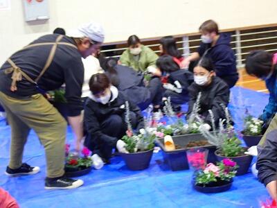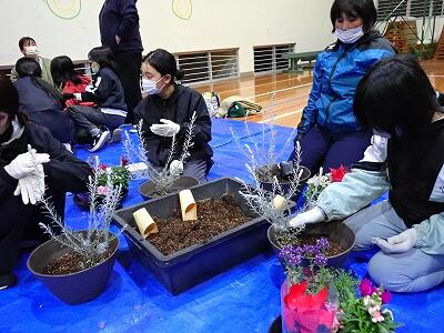 12月17日(水)、学校のPTA活動(家庭教育学級)で3校合同寄せ植え教室を開催しました。通山小の成人教育部のお母さん方が計画・準備し、多賀小と国光原中のおうちの方や児童生徒も参加して、たいへん盛り上がりました。