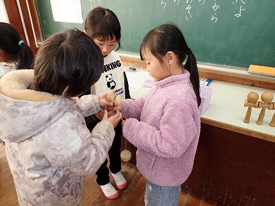 12月22日(月)、1年生がめぐみの聖母保育園の年長児さんを招待して交流会を行いました。1年生は、年長児さんが学校に来るまで、教室の窓から外をのぞいては、「まだかな~」と首を長くして楽しみに待っていました。交流会ではいくつかのグループに分かれて、あやとりやけん玉、ヨーヨー等の昔遊びで一緒に遊びました。年長児さんが「うまくできない」と困っていると、1年生が「ここをこうするといいよ」とやさしく教えていました。お兄さん、お姉さんになったな~と、1年生の成長をうれしく感じた交流会でした。